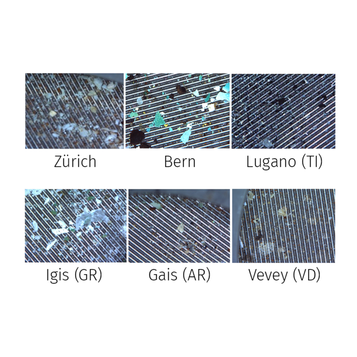 Das feine Edelstahlgewebe des PURE ACQUA® Wasserfilters unter dem Mikroskop – sortiert nach Kantonen in der Schweiz. Die Poren des Filters sind vier Mal feiner als ein menschliches Haar. Sie filtern daher, wie deutlich zu sehen ist, unliebsame Bestandteile effektiv aus dem Trinkwasser. Teilweise sind die Schmutzrückstände sogar mit dem bloßen Auge zu erkennen.